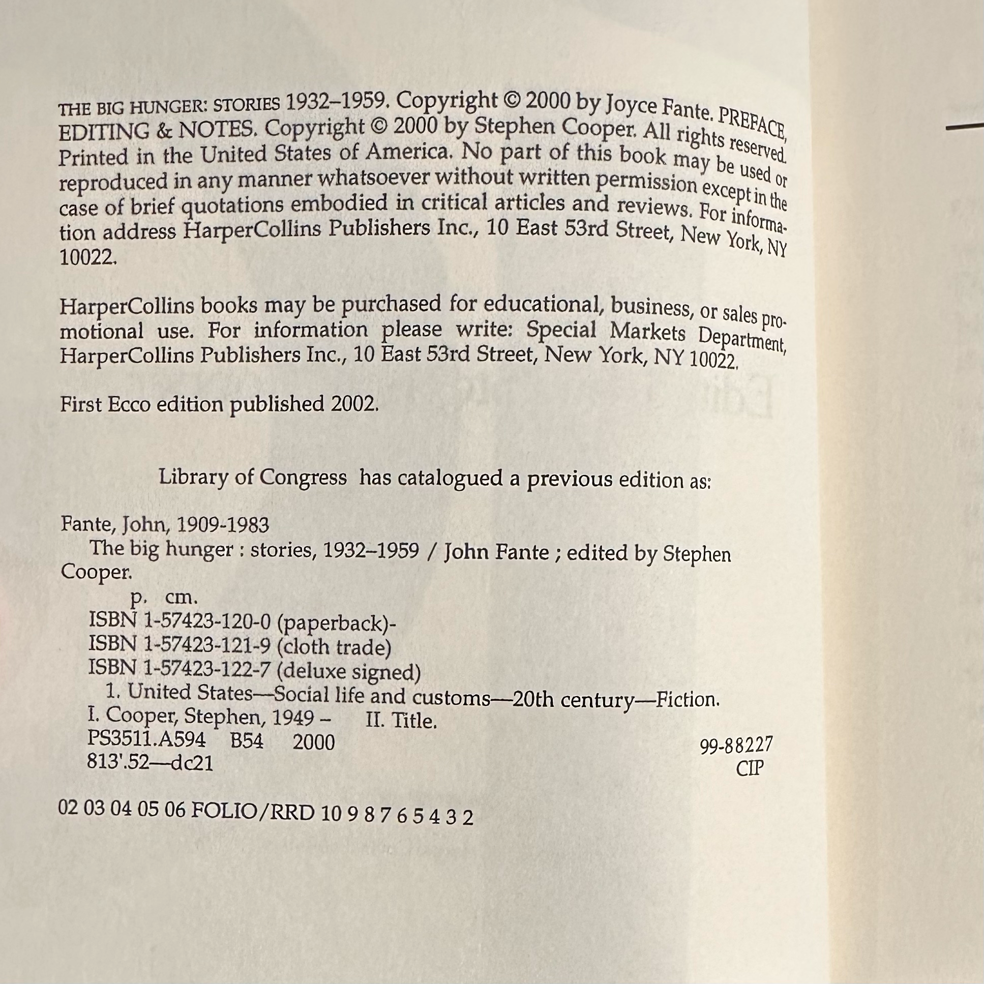 Fiction Paperback: John Fante - The Big Hunger: Stories 1932-1959 SECOND PRINT