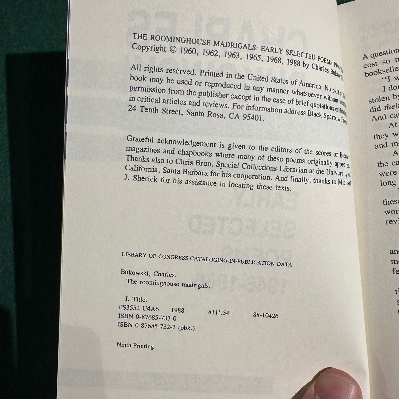 Vintage Poetry Paperback: Charles Bukowski - The Roominghouse Madrigals NINTH PRINTING